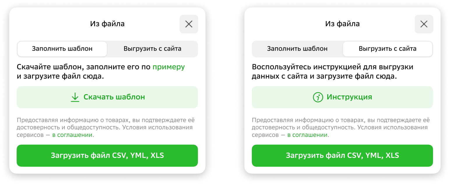 Добавить ссылку на каталог в формате YML или CSV. Это предпочтительный способ для крупного каталога с частым обновлением ассортимента. Получить ссылку можно прямо с вашего сайта по инструкциям для 1С-Битрикс, WordPress, Tilda и др. Либо самостоятельно настроить выгрузку по этой инструкции вместе с вашим техническим специалистом.